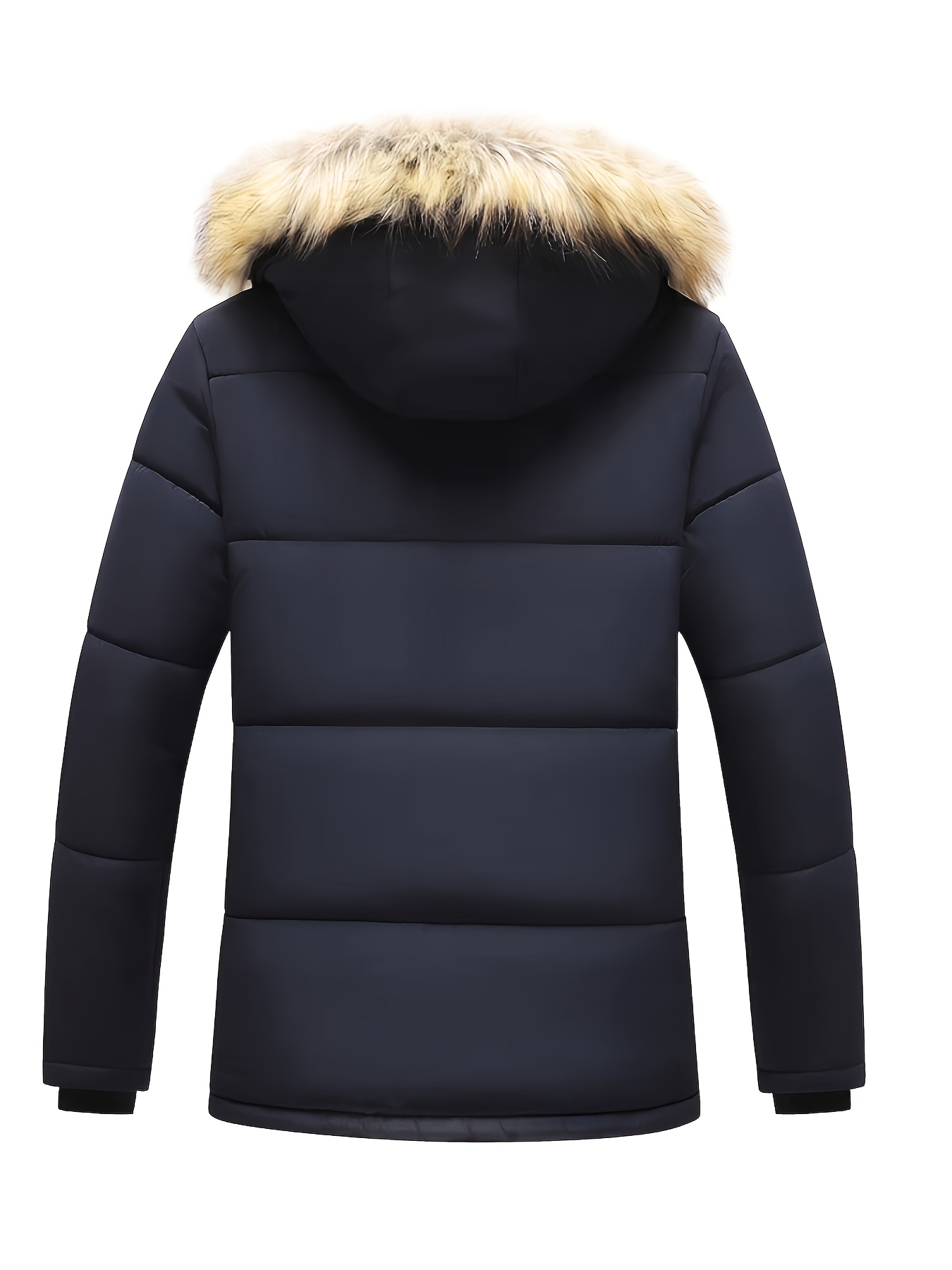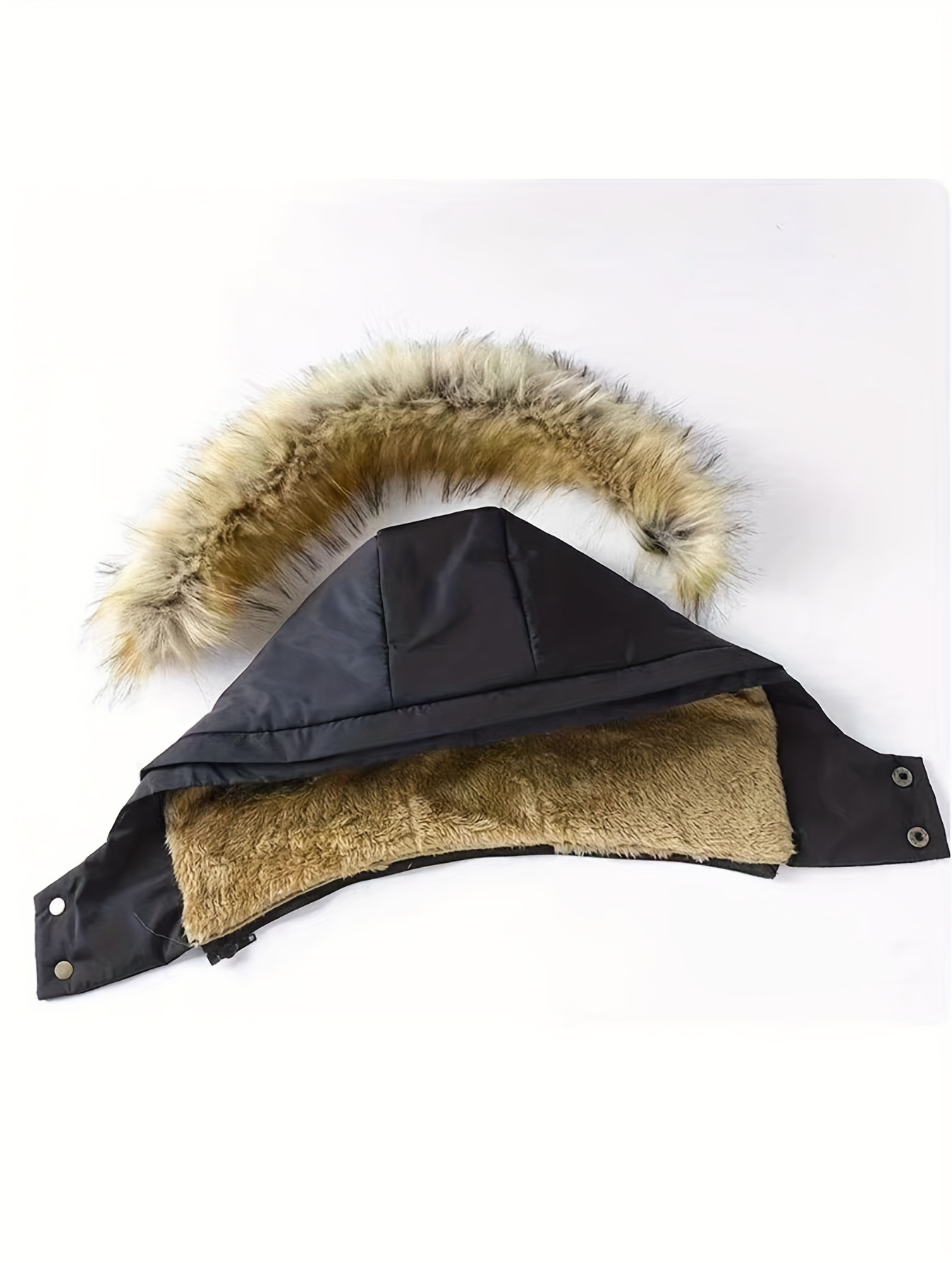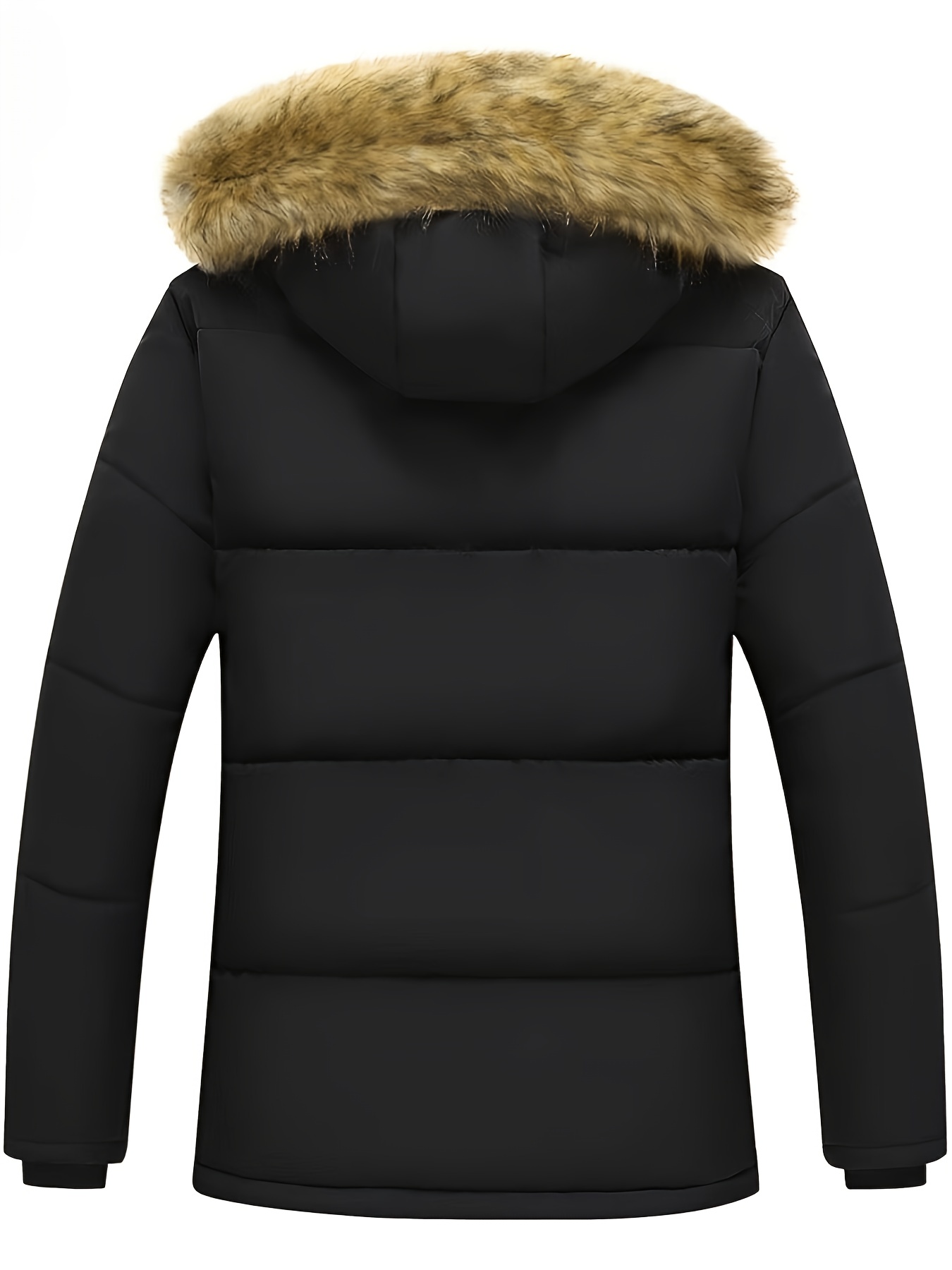 Stay protected and stylish during harsh winter days with this men’s heavyweight thermal coat. Designed with a thick, warm outer shell and insulated with 100% polyester filling, this full-zip hooded jacket delivers reliable warmth in cold weather. A golden-tan faux fur trim adds visual contrast and extra comfort around the hood, while zippered pockets offer practical storage. The non-stretch polyester fabric provides wind resistance, making this jacket ideal for skiing, winter commutes, and outdoor activities. Built for performance and comfort, it’s a must-have for cold-season wear.