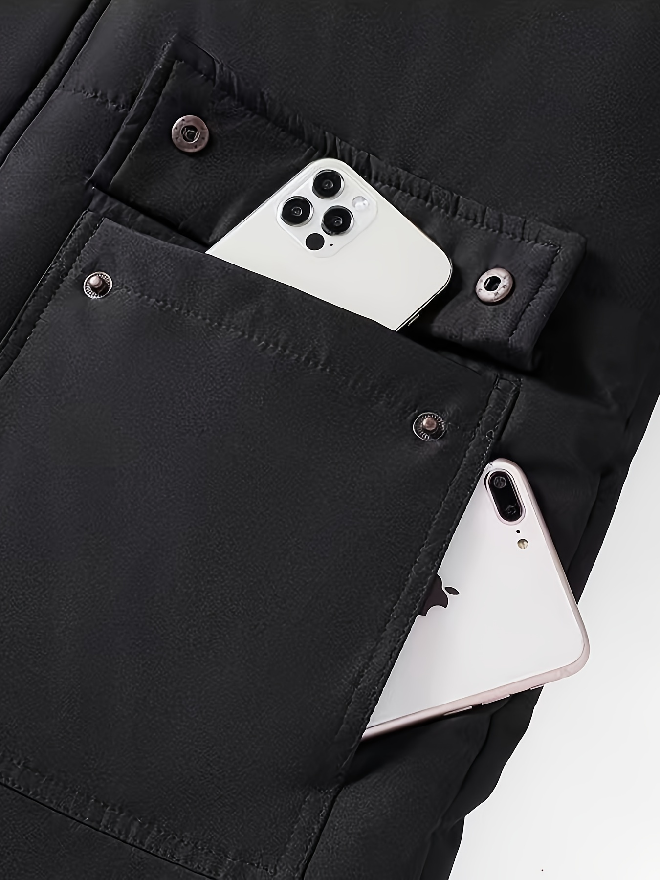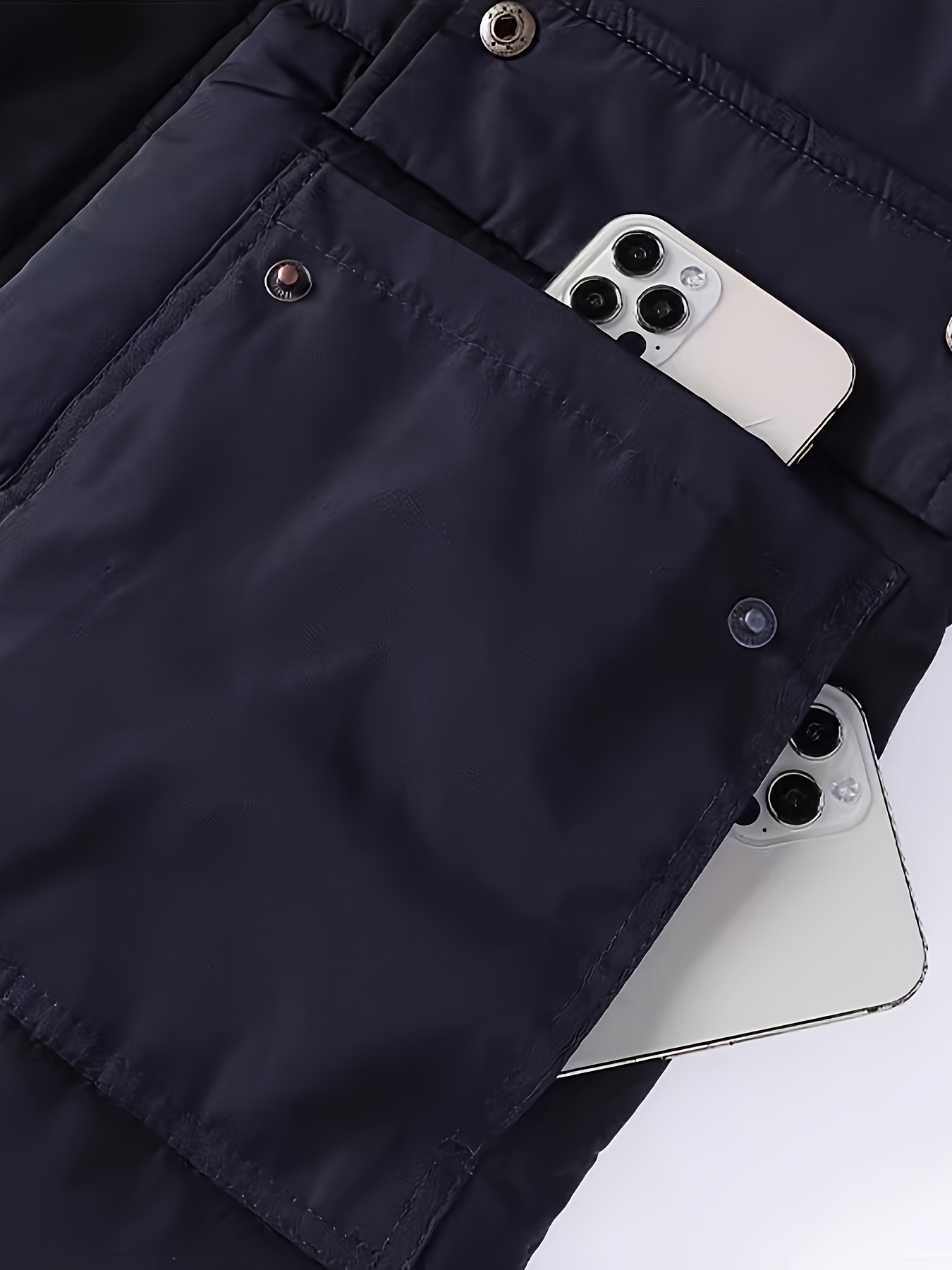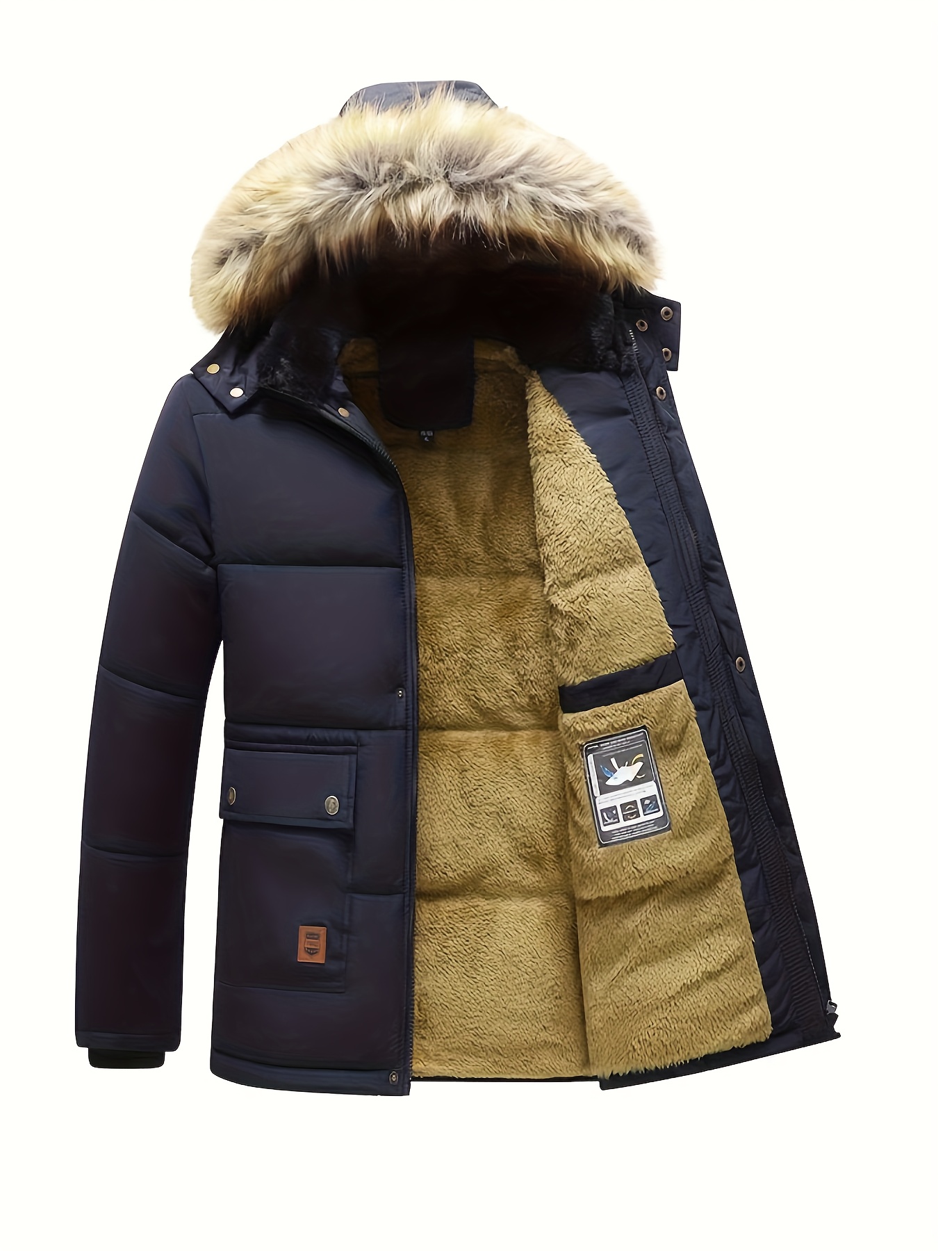 Stay protected and stylish during harsh winter days with this men’s heavyweight thermal coat. Designed with a thick, warm outer shell and insulated with 100% polyester filling, this full-zip hooded jacket delivers reliable warmth in cold weather. A golden-tan faux fur trim adds visual contrast and extra comfort around the hood, while zippered pockets offer practical storage. The non-stretch polyester fabric provides wind resistance, making this jacket ideal for skiing, winter commutes, and outdoor activities. Built for performance and comfort, it’s a must-have for cold-season wear.